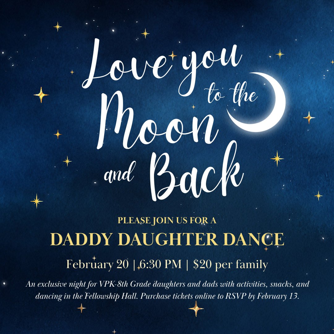 Our school on campus Parkwood Prep, is hosting a Daddy - Daughter Dance Event. An exclusive night for VPK-8th Grade daughters and dads with activities, snacks, and dancing in the Fellowship Hall. Event is open to both school and church members.